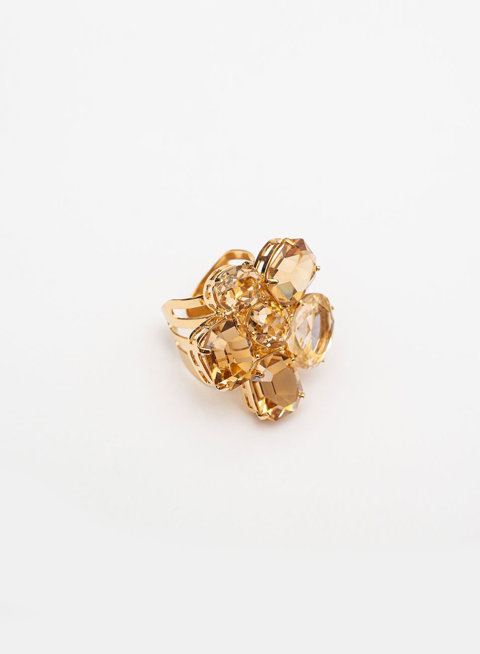 Sua base redonda é cuidadosamente cravejada com cristais champanhe nas lapidações oval e quadrada, criando uma composição harmoniosa e de brilho refinado.