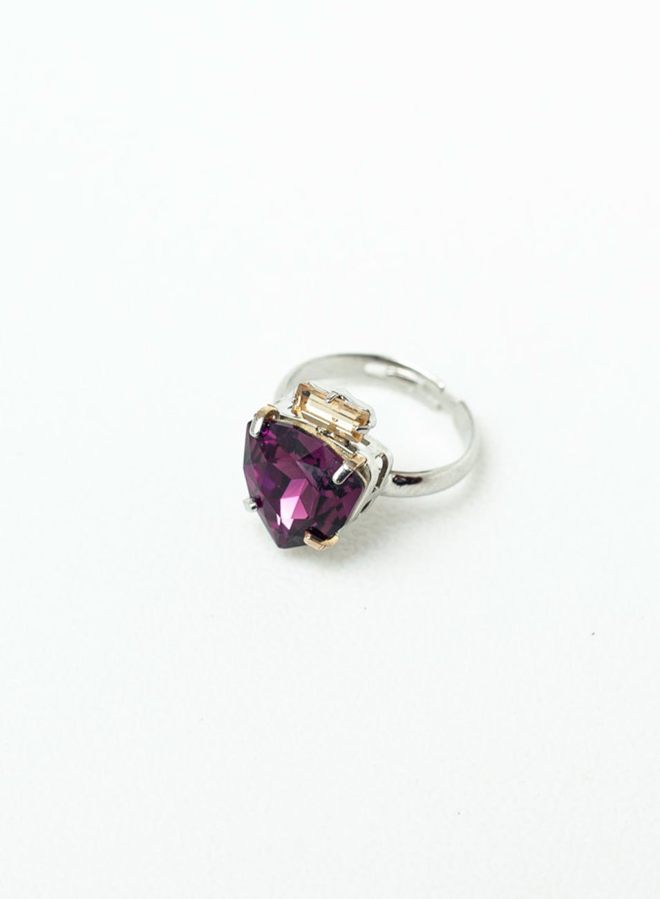 O Anel Cairo é produzido por estruturas de metal nobre, em banho ródio branco, com base cravada por cristal triangular, na cor roxa, e cristal baguete, na cor bege.