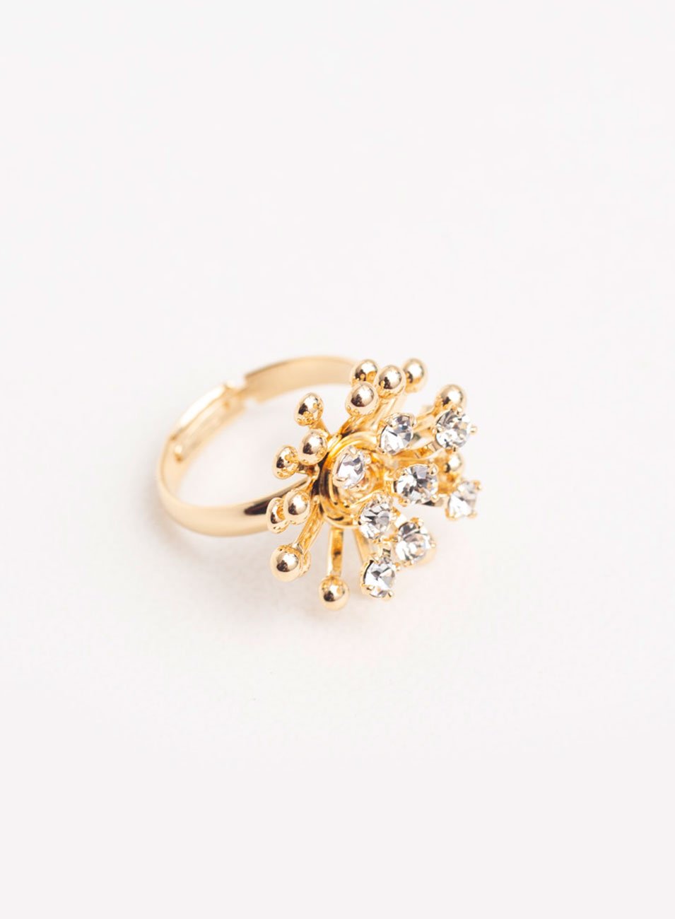 O Anel Calm possui aro aliança regulável, feito em metal nobre e banho ouro, contendo uma base decorada por cachos de tubinhos de metal e um punhado de mini zircônias incolores.