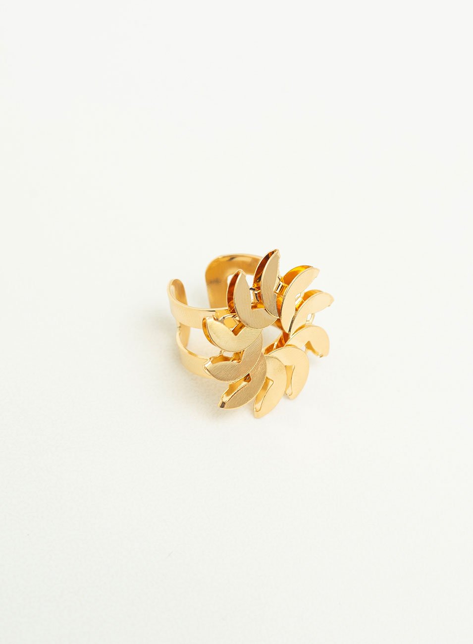O aro aberto e vazado é regulável, garantindo um ajuste confortável e personalizado. O banho em ouro adiciona um toque de luxo e calor, complementando a sensação de opulência e brilho que a peça oferece.