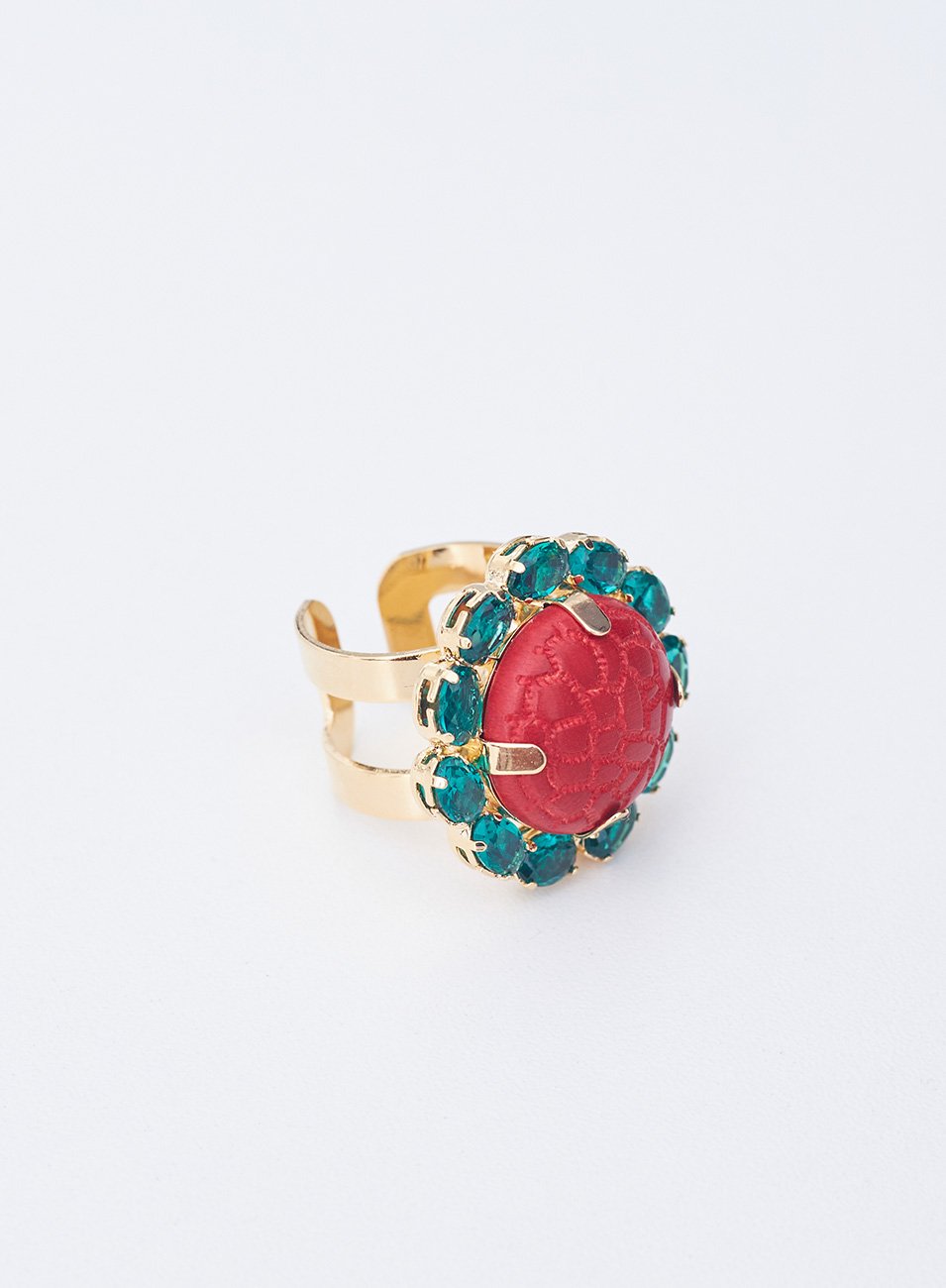O Anel Eva é produzido com aro duplo regulável, feito de metal nobre em banho ouro, decorado por base de resina vermelha texturizada e cravações de cristais ovais, na cor verde.