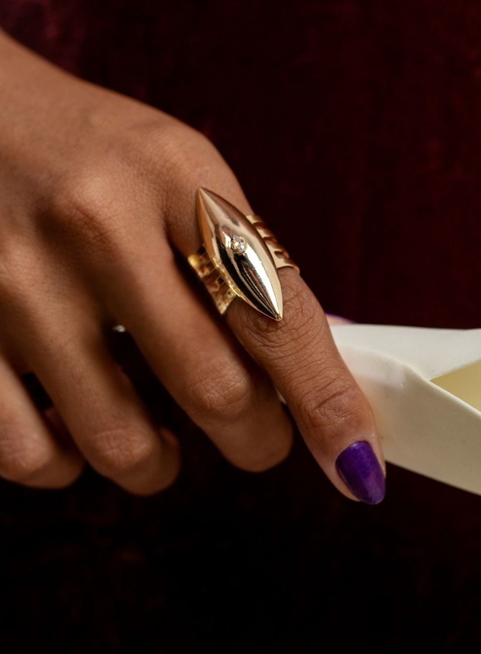 A peça traz como protagonista uma maxi navete metálica, polida e escultural, que remete ao broto fechado em seu estado mais puro e elegante. O design ganha ainda mais presença com o aro largo e regulável, que envolve o dedo com conforto, estabilidade e um toque contemporâneo.