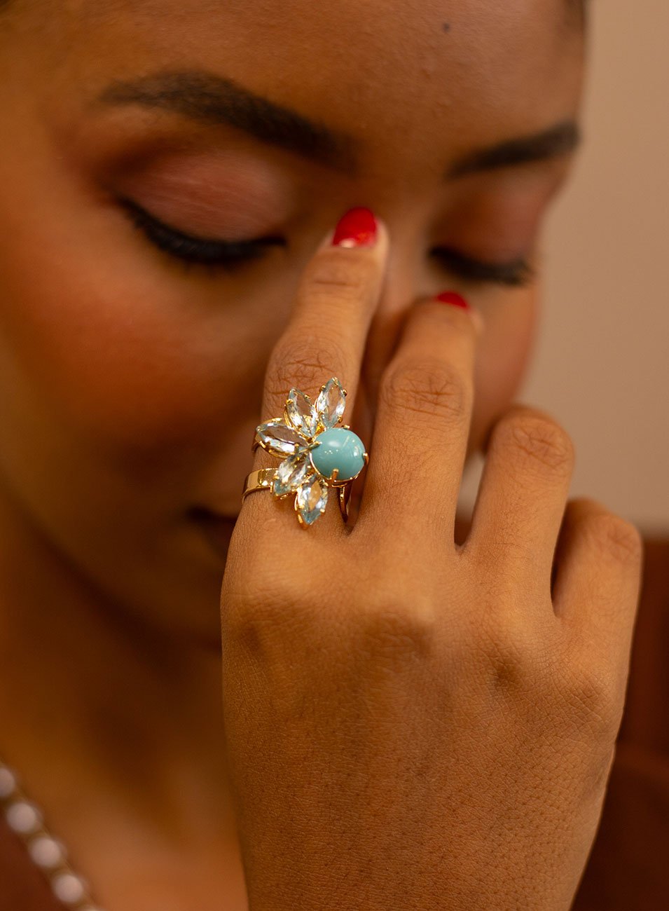O Anel Lang é uma joia de presença marcante e estética floral contemporânea. Composto por cristais de vidro reciclado lapidados em formato navete na cor azul água-marinha, ele envolve uma pérola shell central em cabochão no tom turquesa, criando um contraste luminoso e sofisticado.