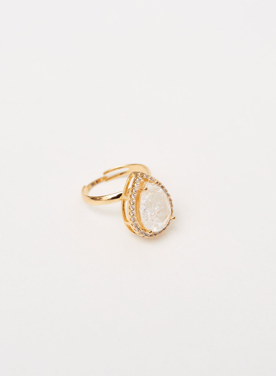 O Anel Mabê é produzido através de aro aliança regulável, feito em metal nobre e banho ouro, decorado com cravações de micro zircônias incolores. Além disso, a peça conta com aplicação de cristal gota incolor, em sua base.