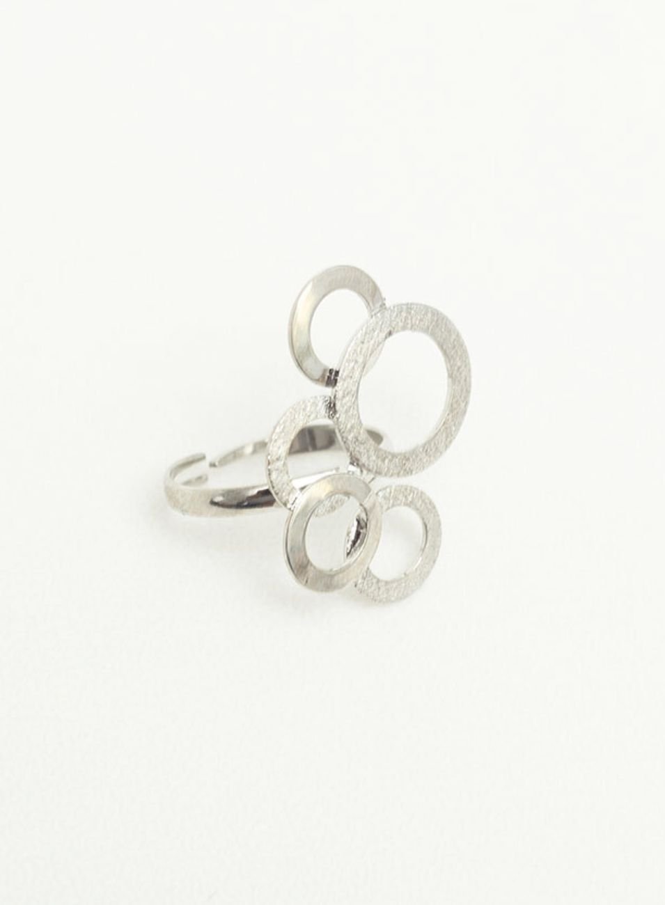 O Anel Madox Prateado traz um design contemporâneo e escultural, construído a partir da composição de círculos vazados em diferentes tamanhos e texturas. O acabamento em ródio branco realça o contraste entre superfícies lisas e acetinadas, criando um visual moderno, elegante e atemporal.