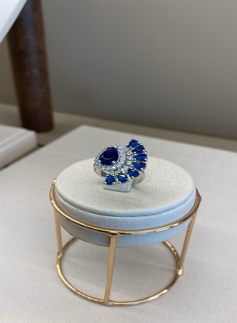 O Anel Mareza possui uma linda estrutura feita em latão coberta por mini zircônias e cravações de cristais gota azuis em sua base. A joia recebe banho em ouro.