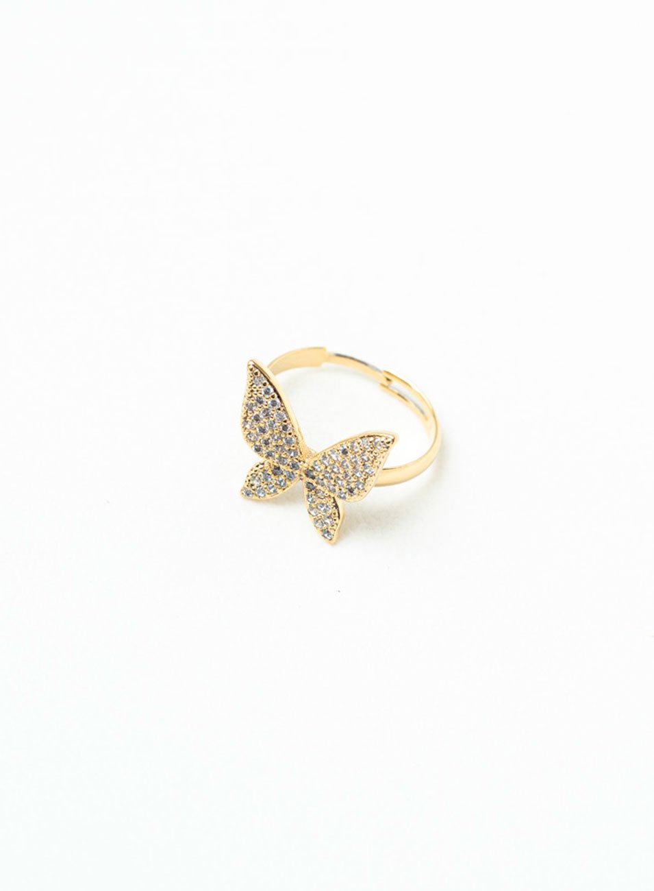 O Anel Nabe é formado por aro aliança e contém uma pequena base em design de borboleta, feita com estrutura de metal nobre em banho ouro. Além disso, sua base recebe cravações de mini zircônias incolores por toda superfície.