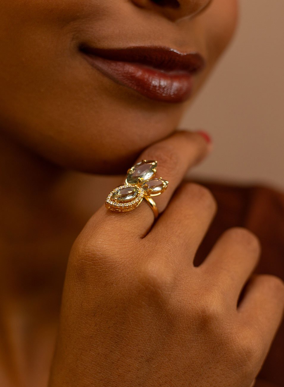 O ANEL NAVII com cristais em tom verde ametista traduz sofisticação contemporânea com inspiração orgânica.