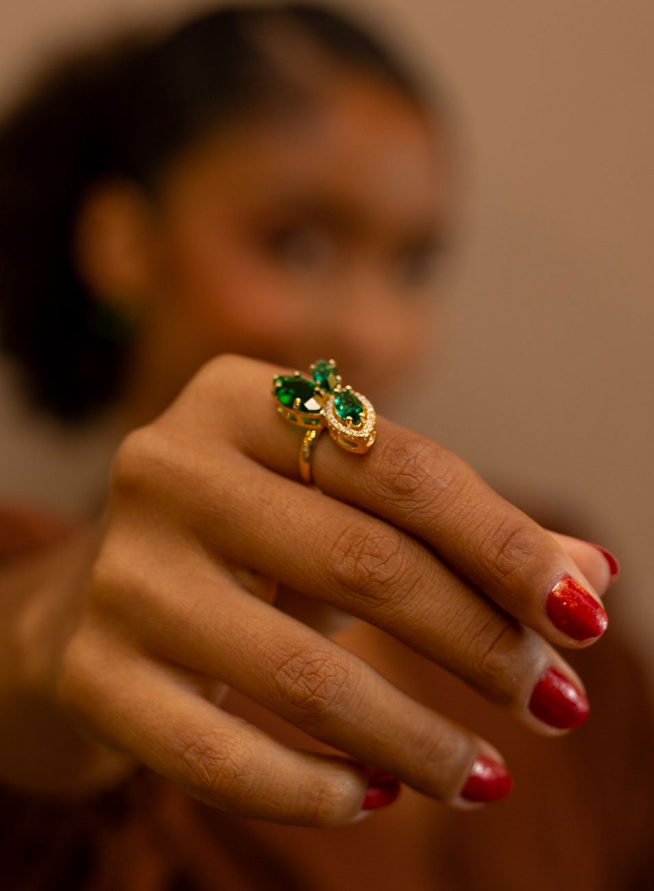 Inspirado em formas orgânicas que lembram folhas e caminhos naturais, o design traz três navetes facetadas em tom verde, dispostas de forma fluida e levemente assimétrica, criando um efeito de movimento contínuo sobre a mão.