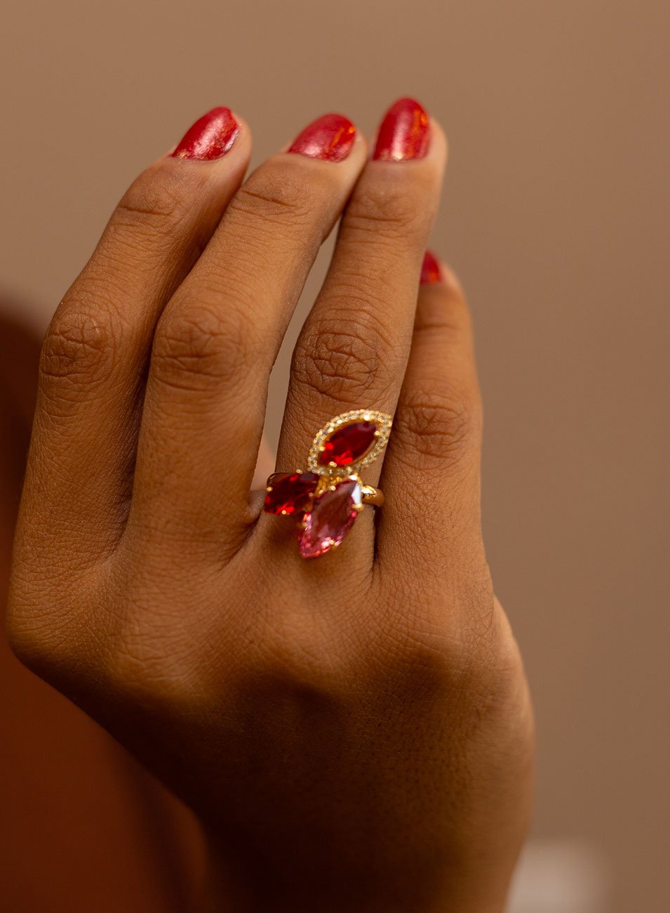 O ANEL NAVII ROSA E VERMELHO traduz movimento, cor e sofisticação em uma joia autoral de forte impacto visual.