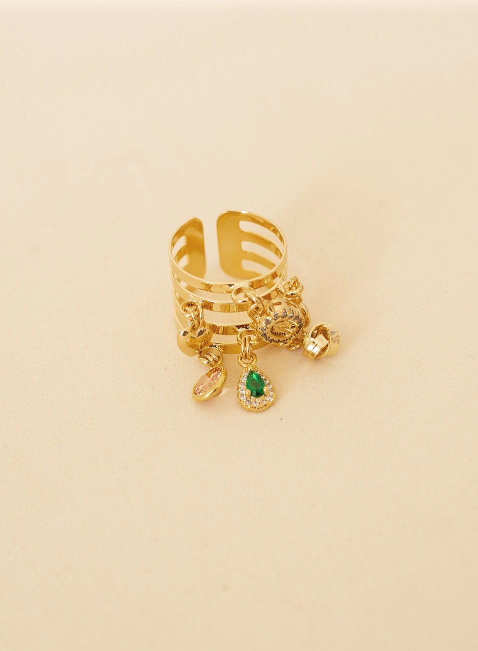 Este Anel Penduricalho N Senhora das Graças é uma verdadeira obra de arte, repleto de simbolismo e beleza. O aro vazado com vários círculos cria um design delicado, enquanto os pingentes adicionam um toque especial. Entre os pingentes, destacam-se a imagem de Nossa Senhora das Graças, uma plaquinha de coração, um cristal gota e um cristal rosa, proporcionando um visual único e encantador.