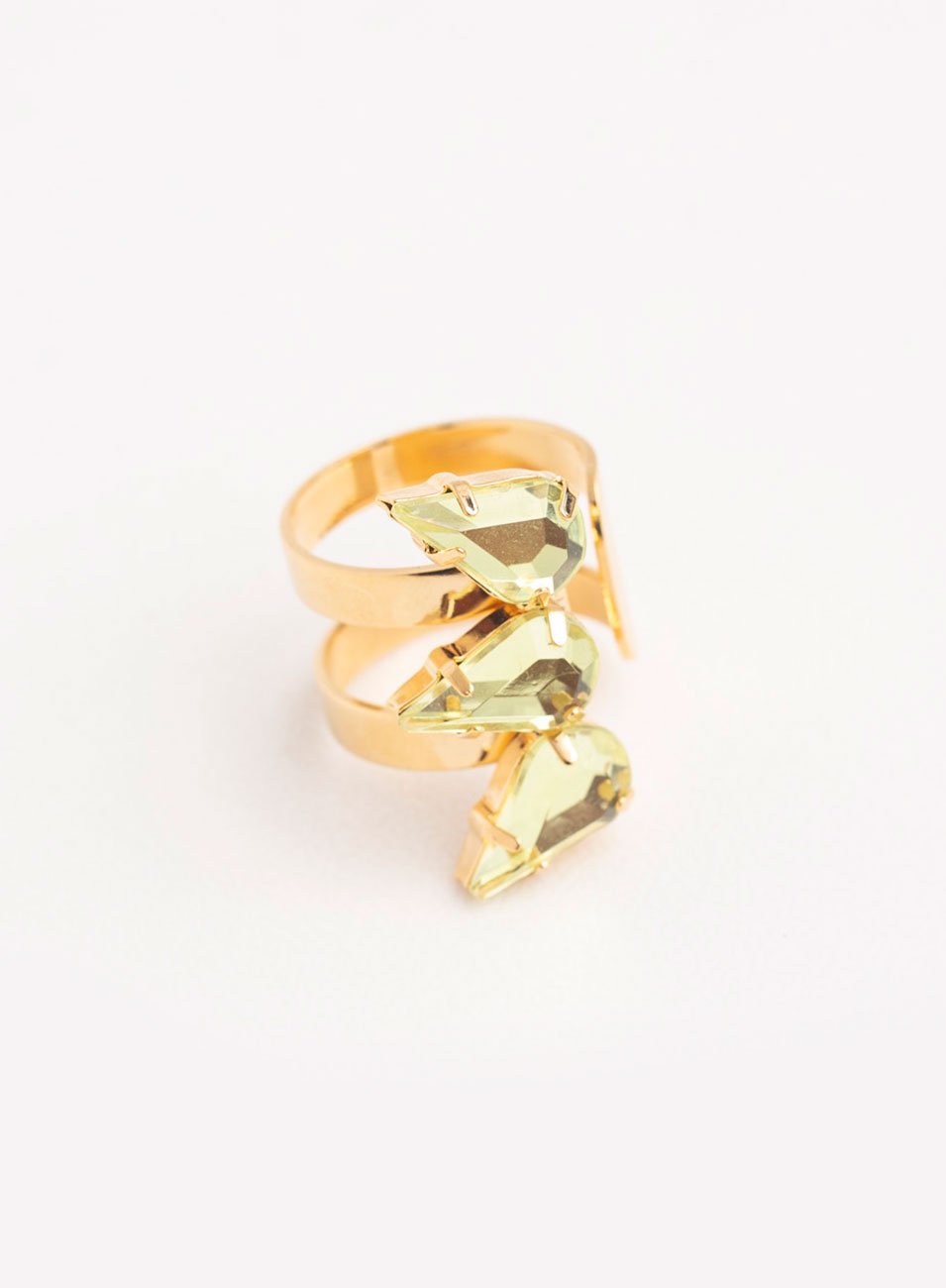 O Anel Solar possui um aro duplo regulável, produzido através de estrutura feita em latão em banho ouro, com base decorada por resinas em formato de gotas finas, em tons verde limão.
