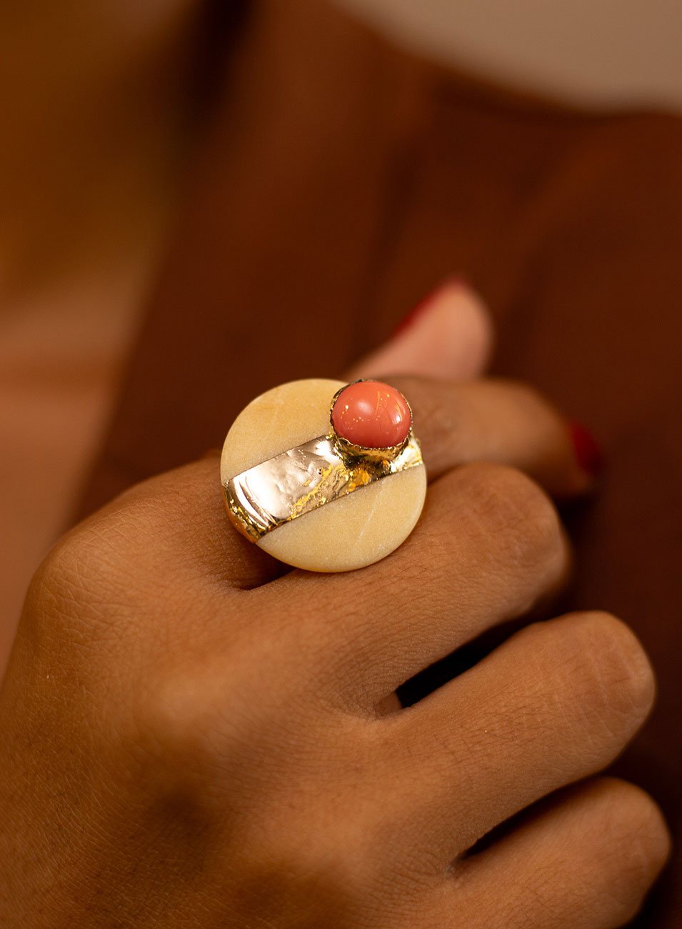 O Anel Solar traduz força, luz e sofisticação em uma composição marcante e autoral. Seu topo circular em jade laranja remete à energia do sol, enquanto o detalhe em cabochão de pérola nobre na cor coral acrescenta contraste, delicadeza e personalidade à peça.
