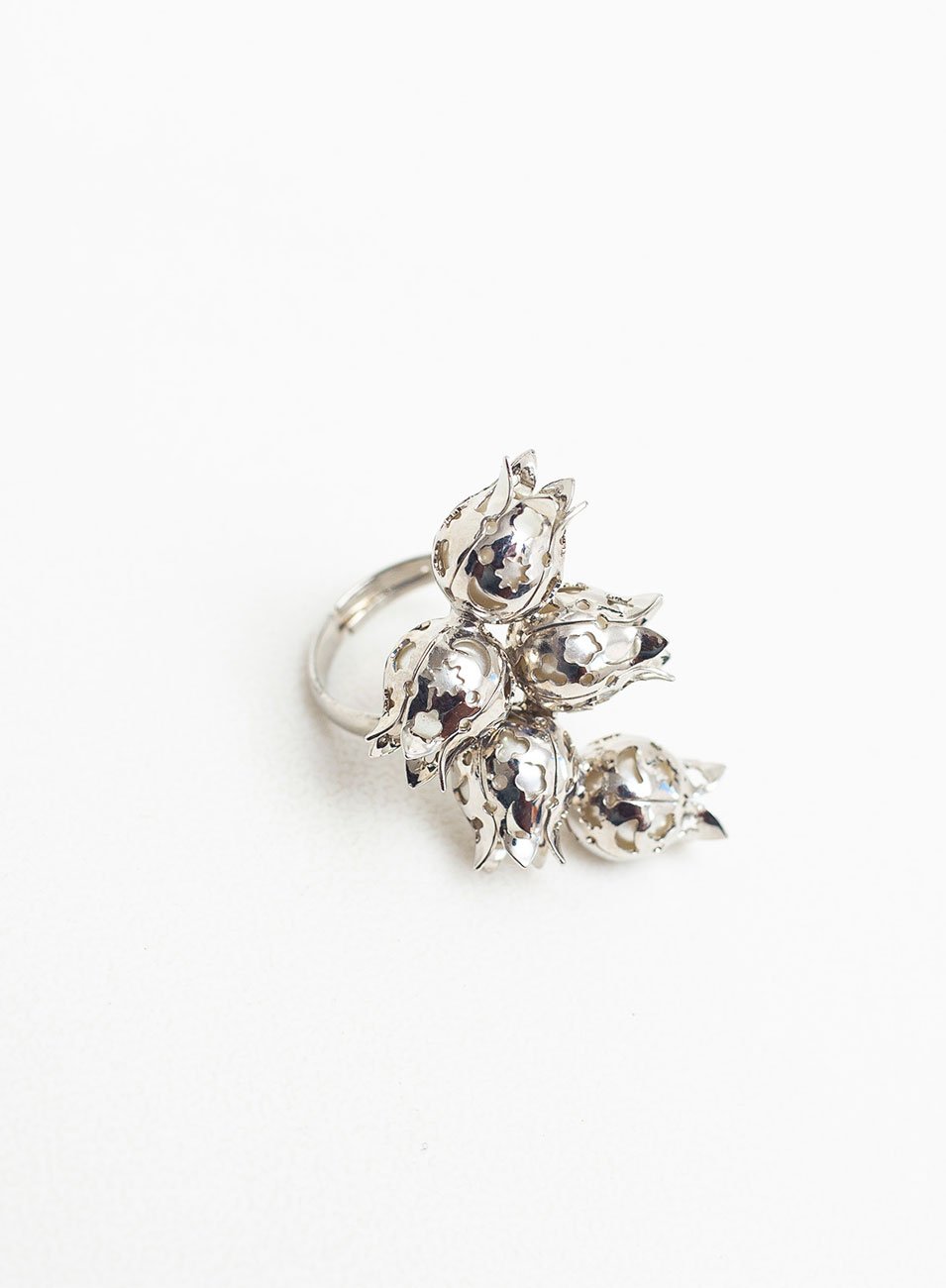 Além disso, o anel apresenta pérolas naturais, que adicionam ainda mais sofisticação ao design. As pérolas são de alta qualidade e têm um brilho suave e delicado, que complementa perfeitamente as tulipas de metal.