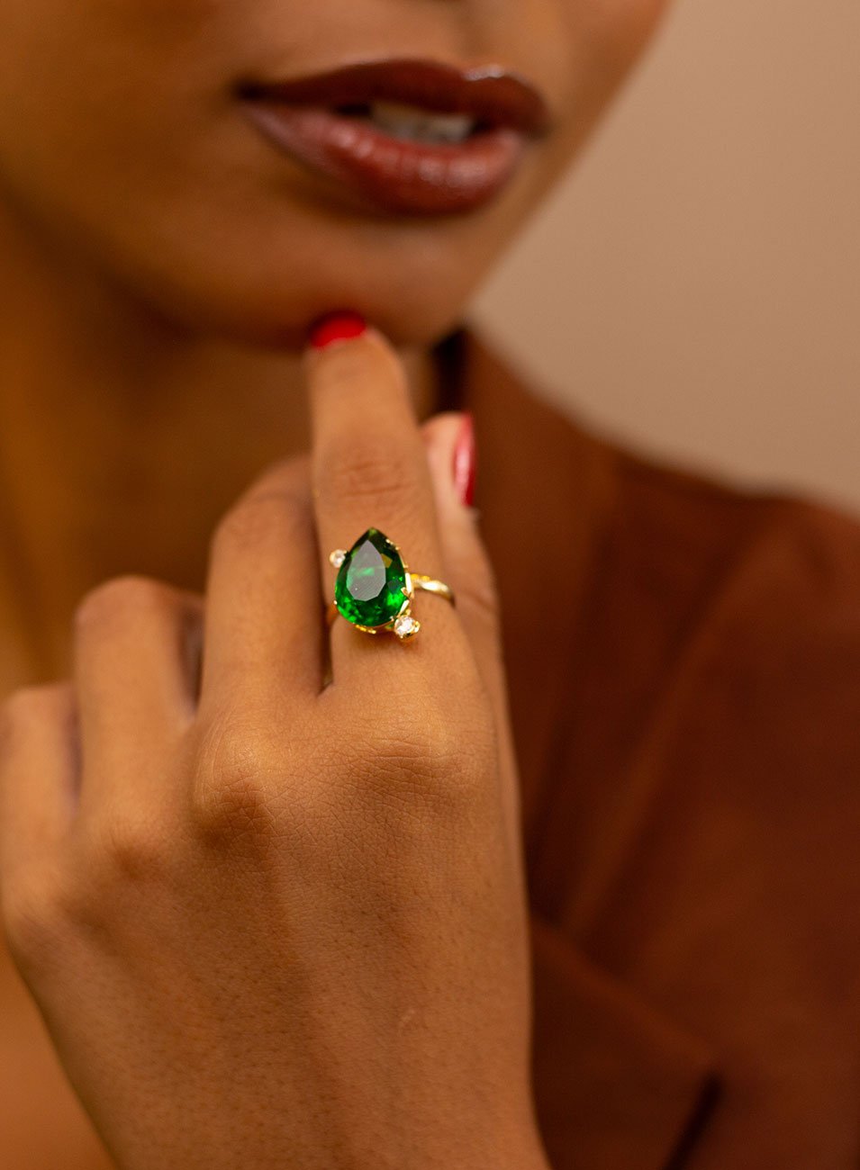 O aro regulável garante conforto e adaptação perfeita, enquanto o banho de ouro aquece a composição e realça ainda mais o tom esmeralda.