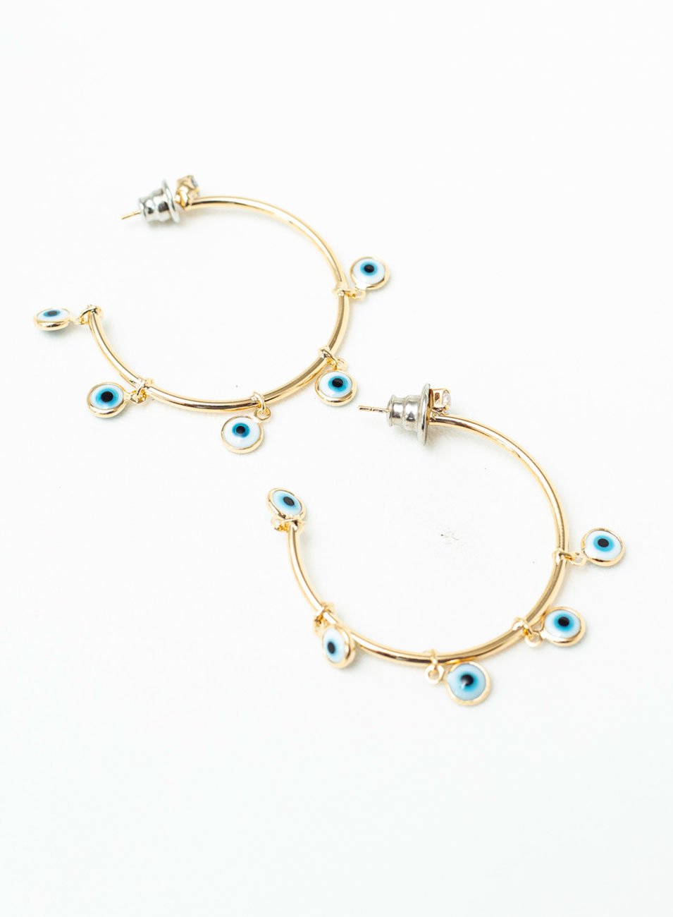 As Argolas em destaque são formadas por aros finos, tamanho M, feitos de metal nobre e banho ouro. Além disso, os acessórios recebem significado especial, já que carregam com si pingentes olho grego, resinados nas cores do amuleto, que simbolizam proteção contra energias negativas, mau-olhado e é também conhecido como um símbolo da sorte.