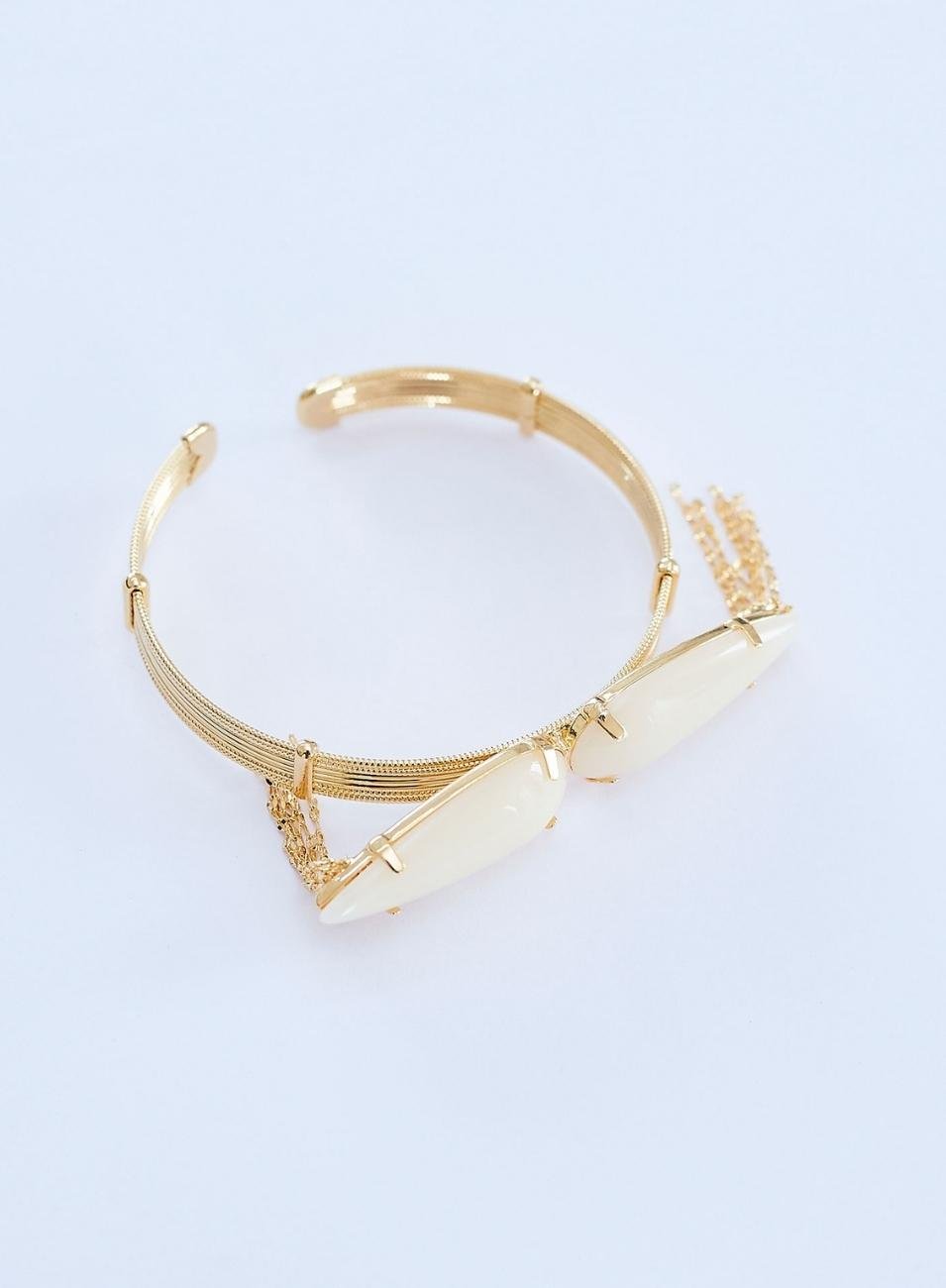 O Bracelete Anita possui um arco regulável, produzido com metal nobre em banho ouro. Além disso, sua base frontal recebe decoração com 2 cristais gota finos, na cor bege, e apliques de franjas em cada lateral do acessório.