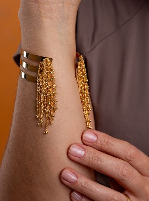 O Bracelete Domo traz um design moderno e cheio de personalidade, com franjas delicadas de pequenas esferas douradas que criam um efeito fluido e elegante no pulso. O banho em ouro acrescenta brilho e um acabamento refinado, tornando essa peça ideal para quem busca uma joia marcante, mas ao mesmo tempo leve e versátil.