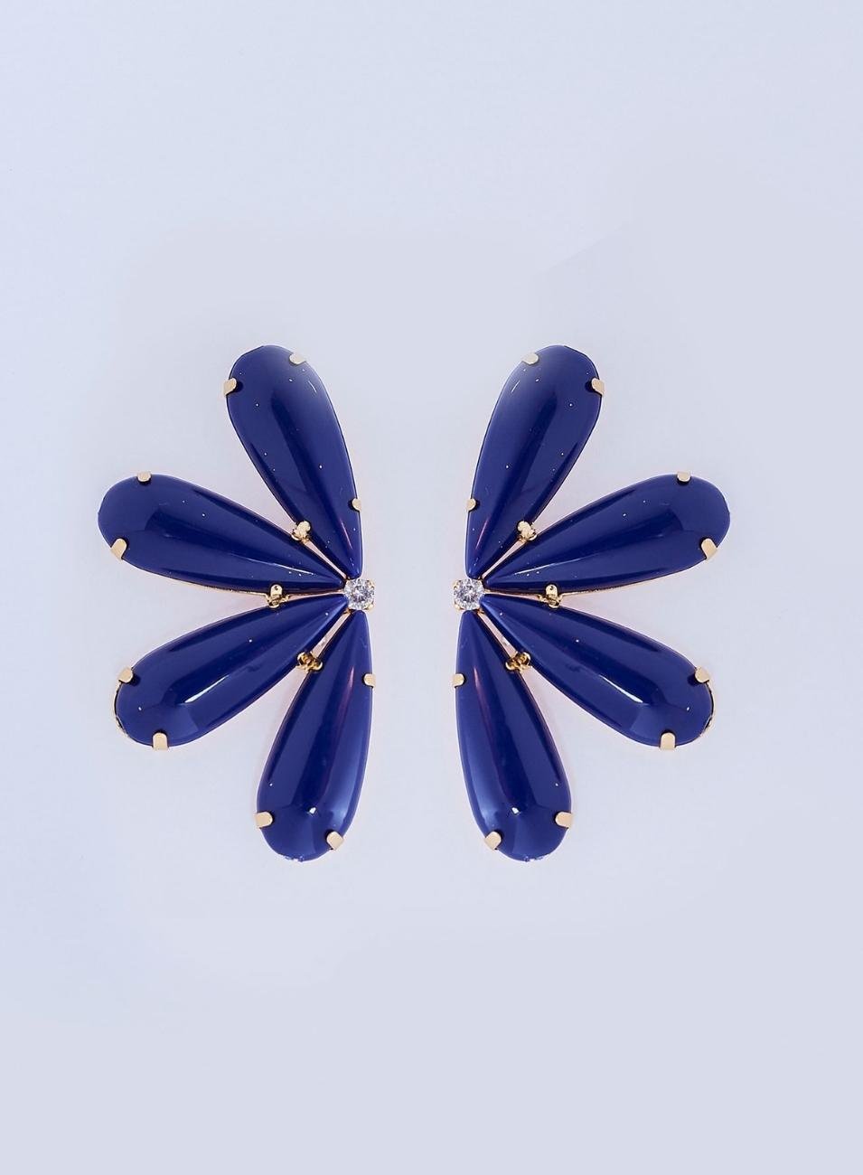 Os Brincos em destaque são produzidos com bases de metal nobre em banho ouro, com cravações de cristais gota longos, na cor azul. Além disso, a peça recebe aplicação de zircônia incolor na parte central da superfície.