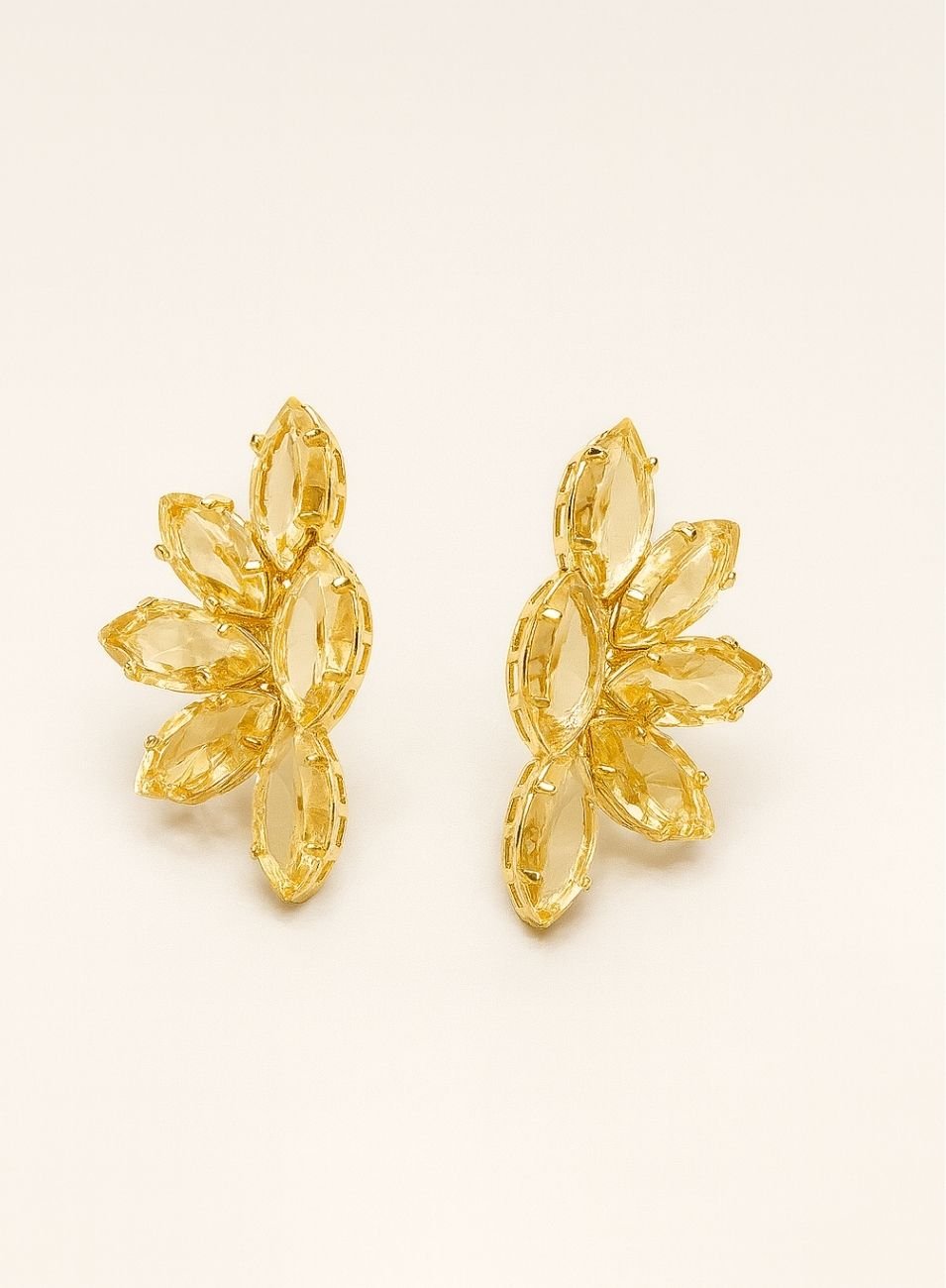 O brilho dos cristais bege, aliado ao banho de ouro, traz um visual vibrante e sofisticado, perfeito para iluminar o rosto e transformar qualquer produção.