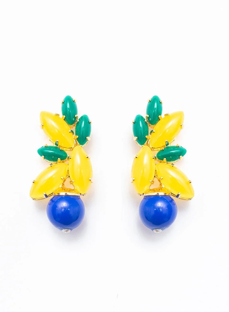 Os Brincos Braza são formados por estruturas de metal nobre, em banho ouro, decorados com mix de cristais rutilados, nas cores: verdes e amarelos, além de pérola azul.