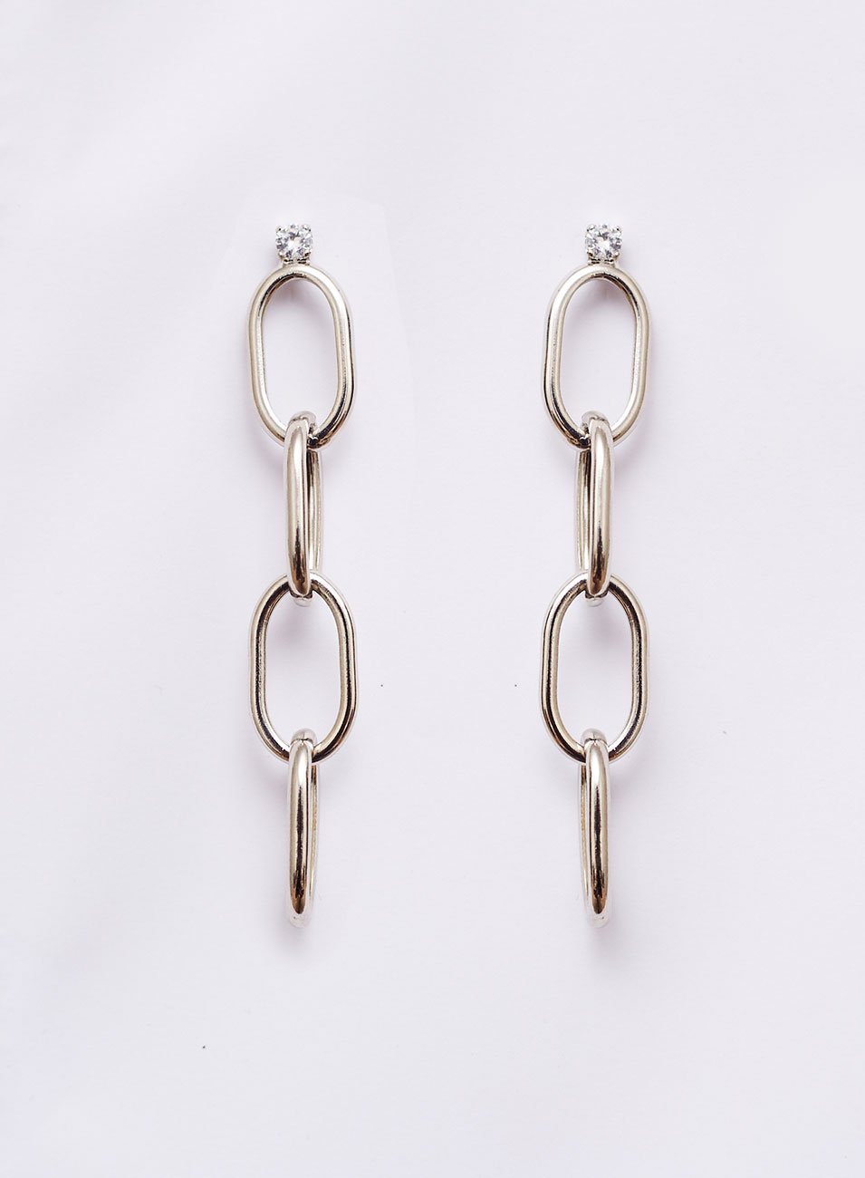 Os Brincos Clip são formados por estruturas de correntes em elos ovais, feitas com metal nobre e banho ródio branco. Além disso, as peças contam com ponto de luz incolor, aplicado em suas bases.