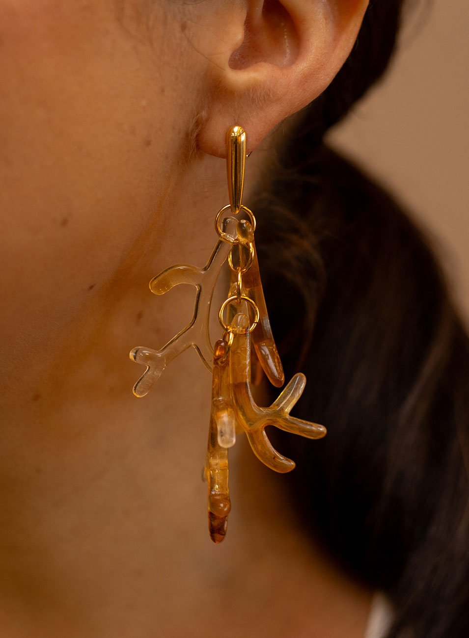Os pingentes em resina translúcida na cor âmbar recriam galhos de corais com transparência suave e brilho quente, criando um efeito visual leve, fluido e luminoso. Cada elemento se movimenta delicadamente com o corpo, trazendo vida e naturalidade à peça.