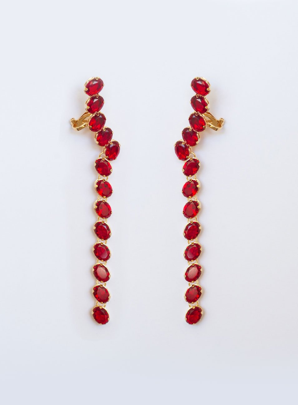 Com uma estrutura alongada de 10 cm, esses brincos são cravejados com cristais ovais na deslumbrante cor rubi, proporcionando um efeito de luminosidade e requinte. O formato ear cuff garante um encaixe perfeito na orelha, enquanto a franja delicada de cristais adiciona movimento e elegância.