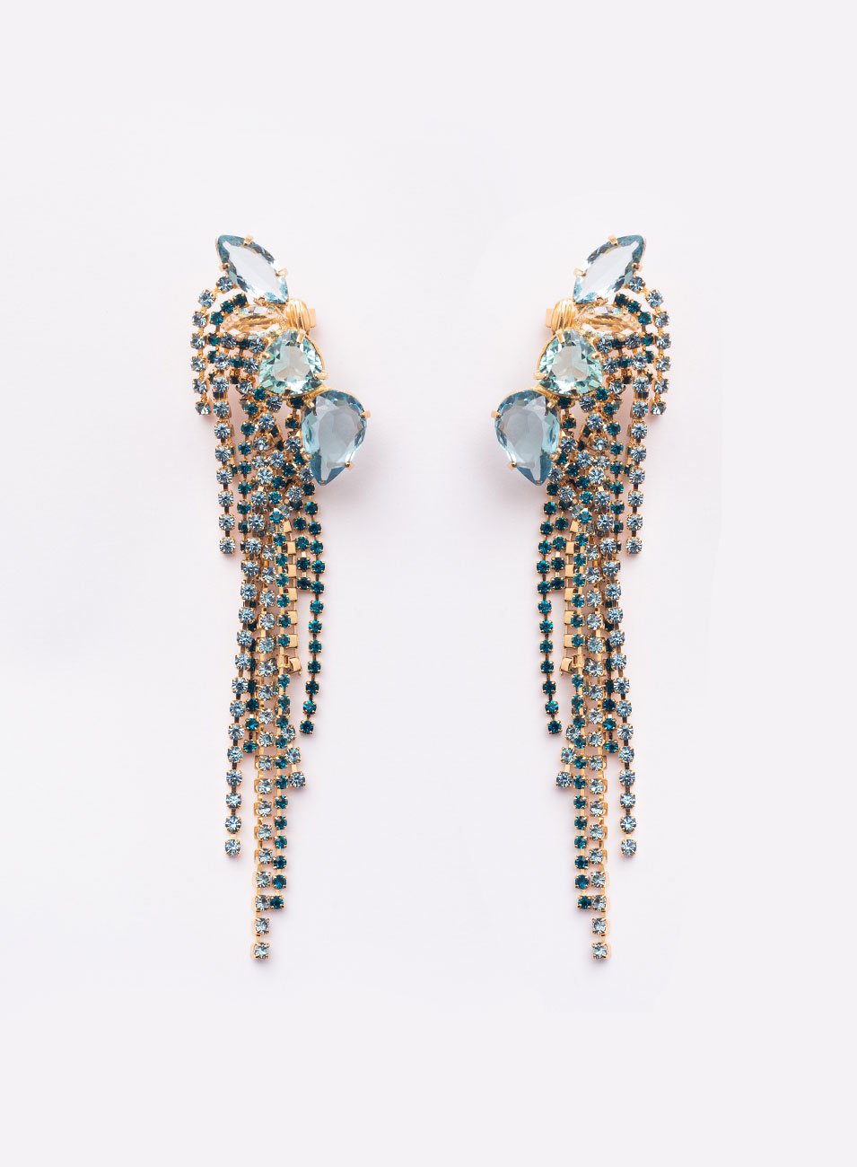 Brincos Ear Cuffs Franja Strass Mix Cristais Azuis | Banho de Ouro