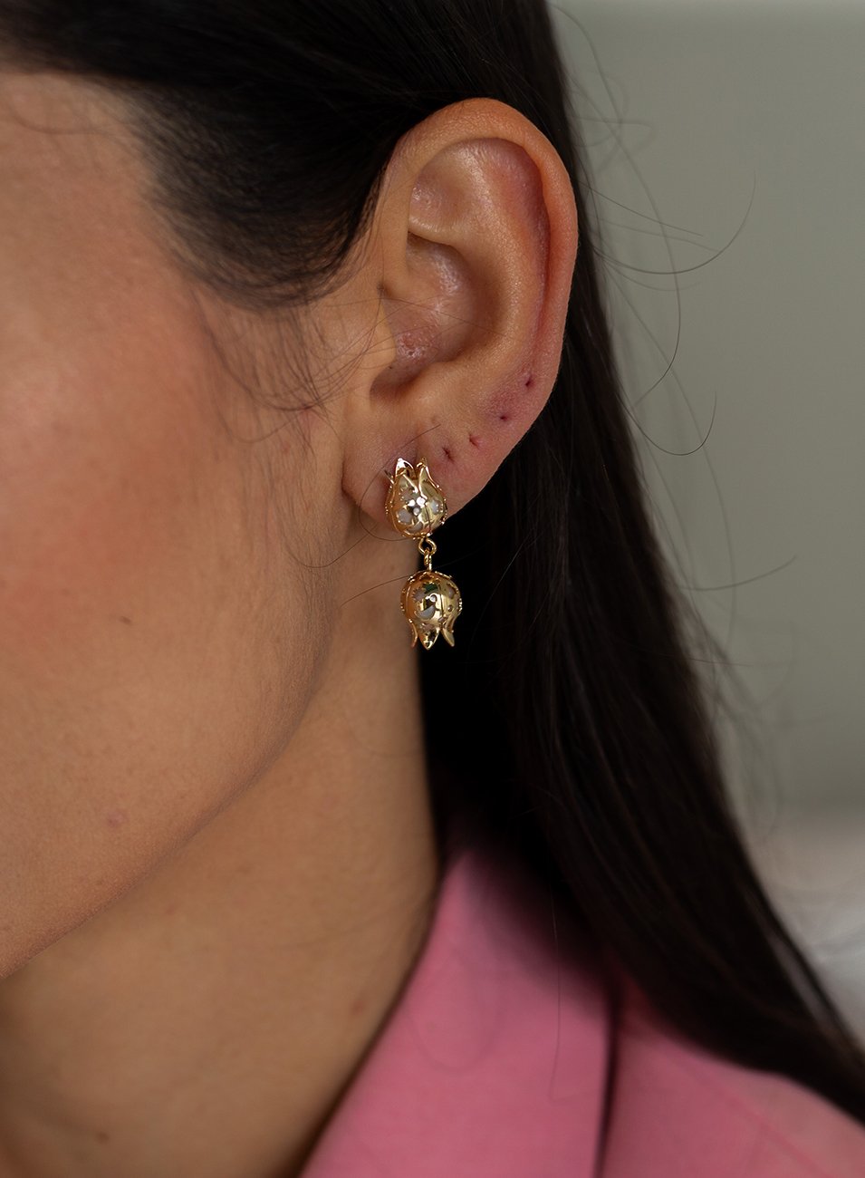 BRINCOS FLOR TULIPA PÉROLAS COM BANHO OURO