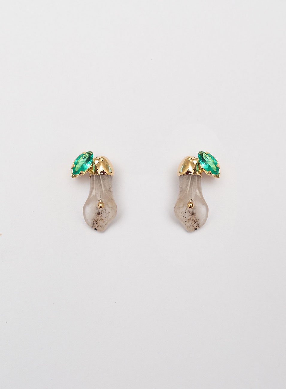 Produzidos em metal nobre com banho de ouro, combinam a suavidade do quartzo rosa com o brilho vibrante do cristal de vidro verde, criando um contraste delicado e encantador.