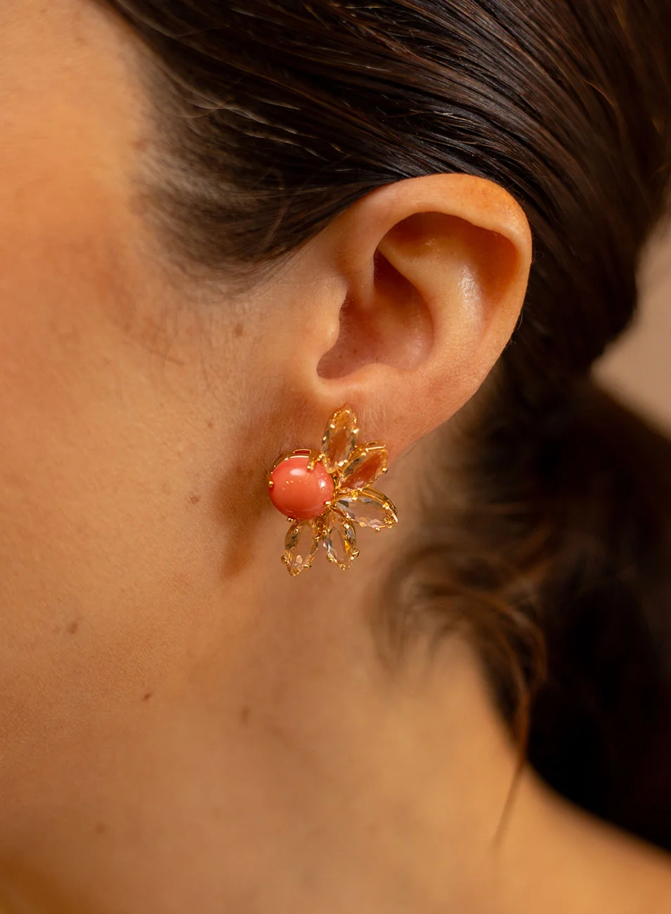 A versão mini dos Brincos Lang traz a mesma sofisticação do design floral original em um tamanho mais delicado e versátil. Com cristais rosê combinados à pérola shell coral, é uma joia elegante, leve e perfeita para quem busca um ponto de cor sutil no dia a dia, sem abrir mão do brilho e do acabamento autoral. O banho de ouro valoriza os detalhes e garante um visual atemporal.