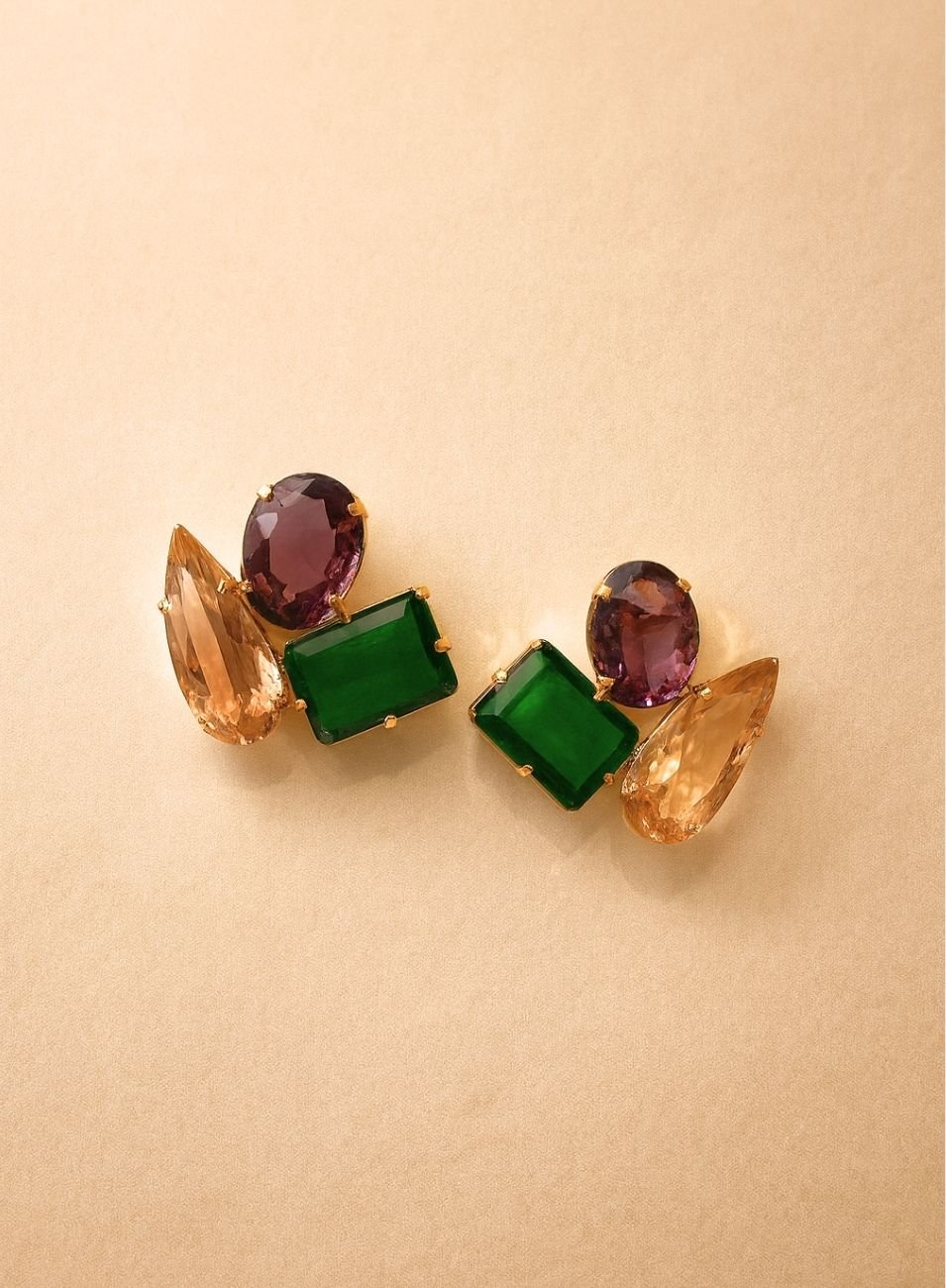 BRINCOS NATURE VERDE E ROXO PRESSÃO BANHO OURO
