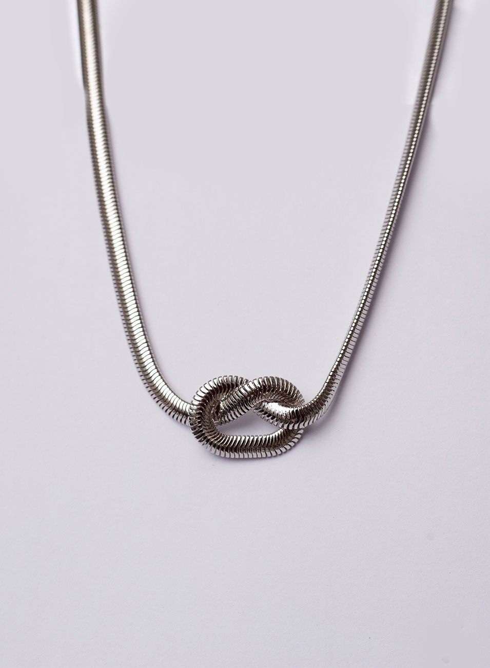 Feita com corrente no estilo rabo de rato achatado, a peça traz um brilho contínuo e sofisticado, enquanto o nó ganha destaque como ponto de conexão e força.