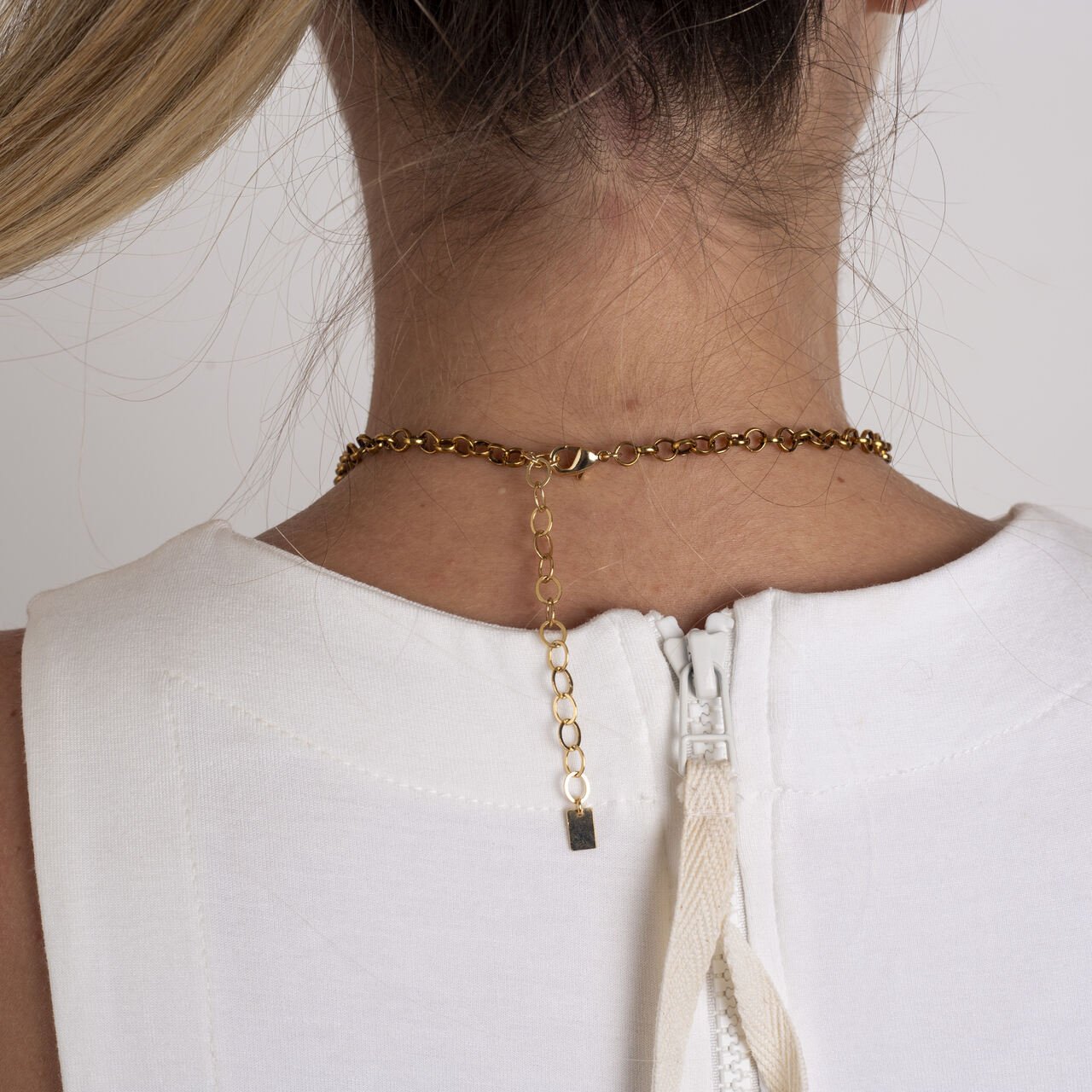 Os elos entrelaçados conferem um design diferenciado à peça, criando uma harmonia entre o clássico e o contemporâneo. O comprimento de 34cm, oferece versatilidade no ajuste, permitindo que você adapte a choker de acordo com o seu gosto e conforto.