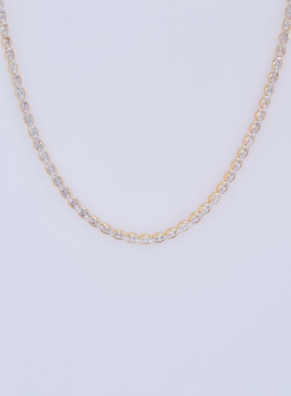 A Choker Francis possui uma corrente curtinha, rente ao pesçoco, feita de metal nobre em banho ouro, decorada por cravações riviera em cristais ovais incolores.