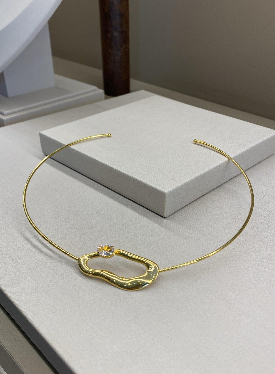 A Choker interlagos conta com um detalhe de metal orgânico e um detalhe de cristal de vidro na cor morganita. Banho de ouro.