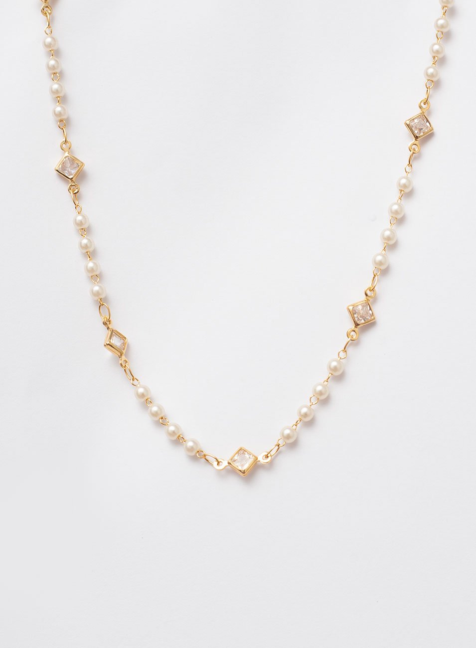 O colar Ivory, feito com corrente de metal nobre, tem sua corrente decorada com pérolas e zircônias incolores.