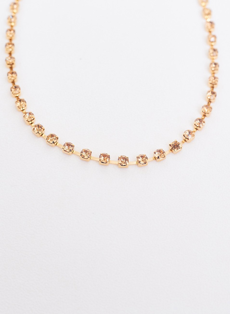 A Choker Jess é formada por corrente curta, feita de metal nobre, e decorada com strass na cor âmbar por todo o seu corpo banhado a ouro.