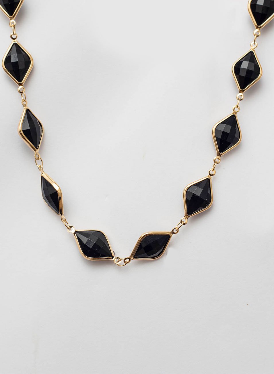 As resinas triangulares negras que decoram a corrente acrescentam um toque de mistério e charme à choker, criando um contraste marcante com o banho de ouro. Essas resinas são dispostas de forma delicada e precisa, dando à peça uma estética contemporânea e única.