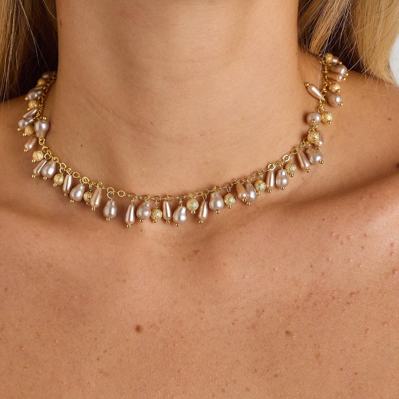 A Choker Mikonos é uma peça deslumbrante que combina a elegância das pérolas com o brilho sutil das esferas douradas. A corrente é decorada com cachos robustos de pérolas cintilantes em tons claros, criando uma composição delicada e sofisticada. O banho em ouro adiciona um toque luxuoso à peça.