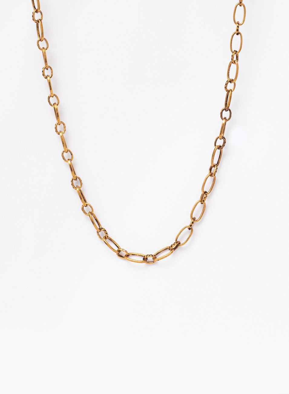 A corrente em metal nobre com banho em ouro velho, combinada com os mini clips interligados, cria um design contemporâneo e moderno. A simplicidade da peça permite que ela seja facilmente incorporada a diferentes looks, proporcionando um toque de atitude.