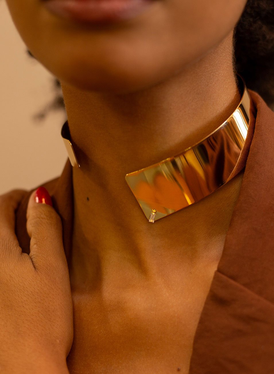 A Choker Passarela é uma joia de impacto, pensada para mulheres que enxergam o acessório como protagonista do look. Com design escultural e acabamento espelhado, ela envolve o colo com presença marcante e sofisticada, remetendo às passarelas de moda contemporânea.