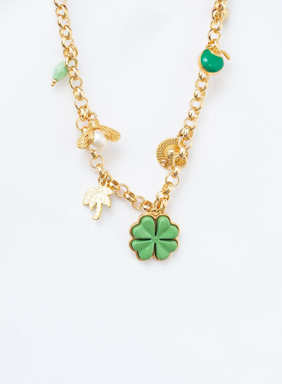 O pingente redondo em design de trevo de quatro folhas verdes simboliza sorte e proteção, sendo um destaque encantador. Além disso, a corrente é adornada com aplicações de pingentes tropicais ao redor, trazendo um charme adicional e um toque refrescante à peça.