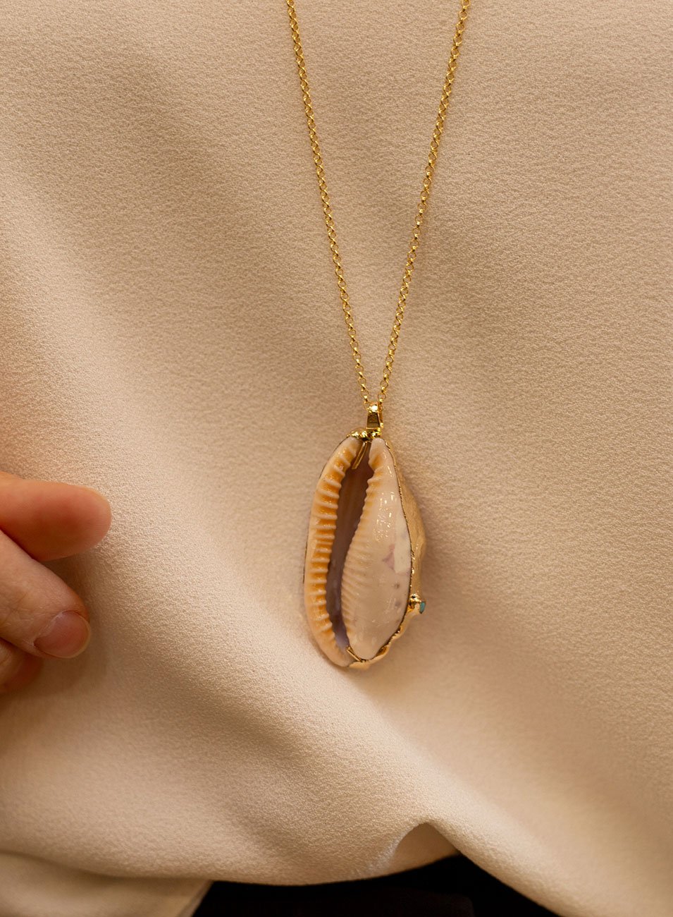 O pingente de búzio natural, com aproximadamente 5 cm, é cravado manualmente com uma cravação orgânica, respeitando os contornos únicos da concha — nenhuma peça é exatamente igual à outra.