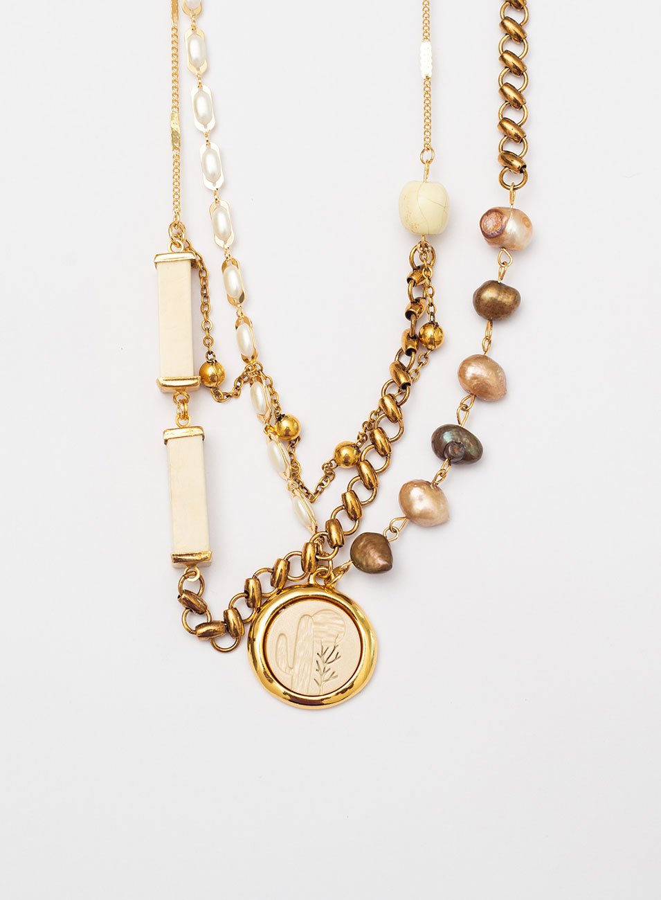 O Colar Cacto Mix é uma joia autoral da Lulu Souto que une poesia e design. Composto por três camadas de correntes, ele traz a delicadeza das pérolas cultivadas e a sofisticação do banho em ouro velho e ouro.