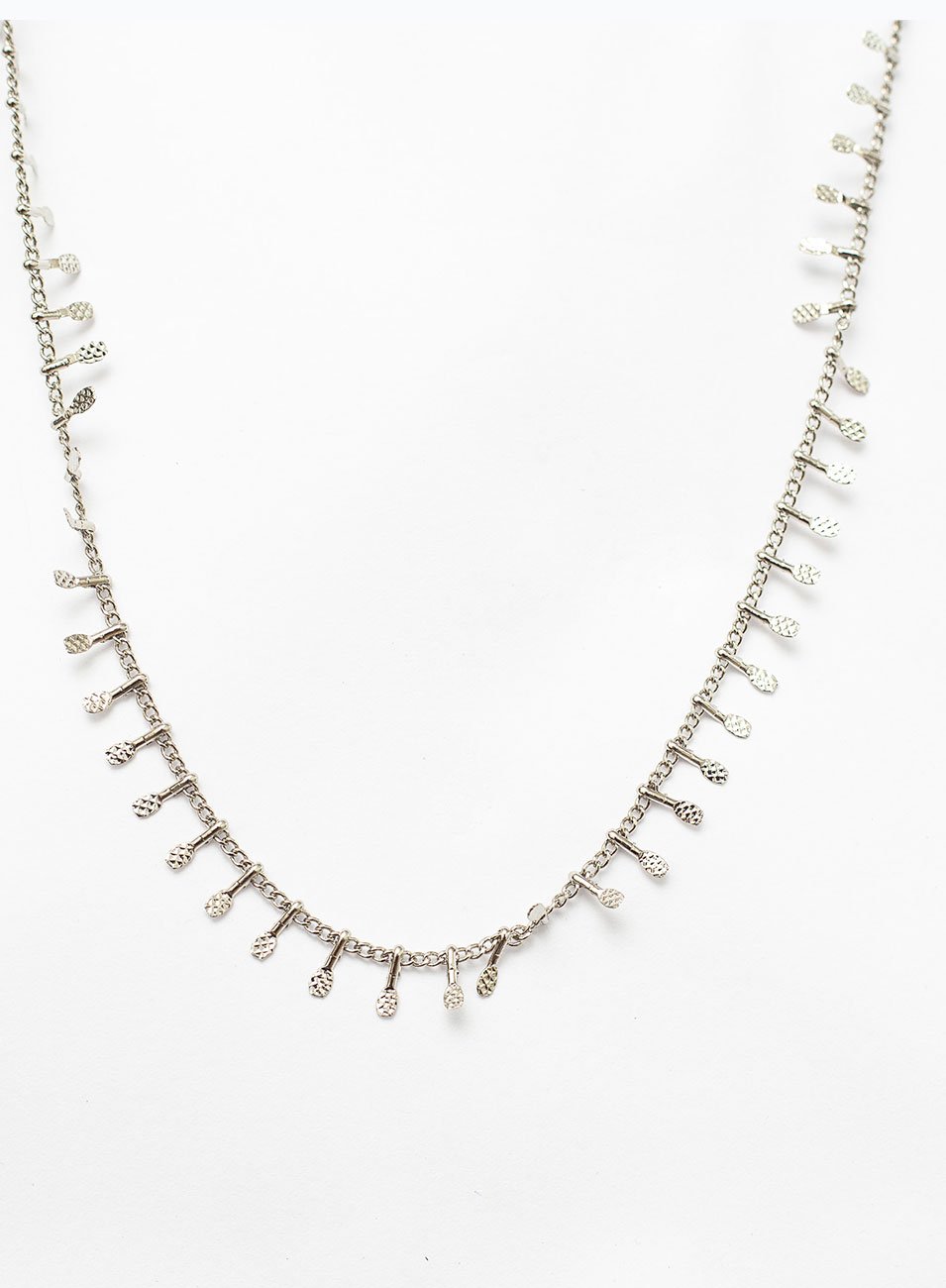 O charme principal do colar são as plaquinhas finas que decoram a corrente. Essas plaquinhas, semelhantes a pedais, são feitas de metal nobre e banhadas em ródio branco, dando a elas um brilho perfeito. Cada plaquinha tem cerca de 1 centímetro de comprimento e é fina e leve, adicionando uma dimensão delicada e sutil ao design geral.