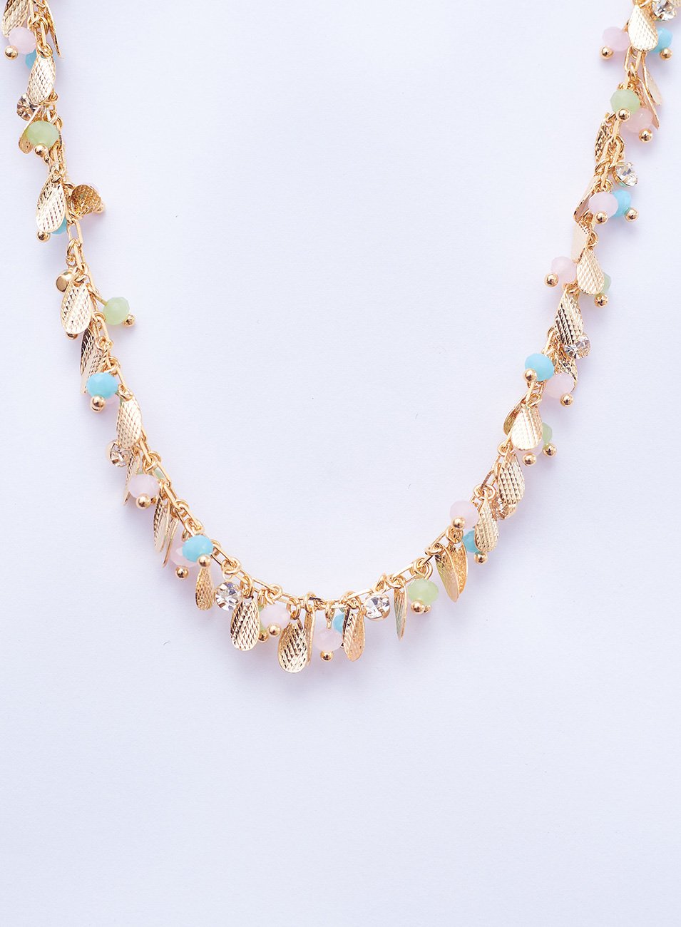 O Colar Folhas recebe uma estrutura robusta, feita com corrente longa decorada por pingentes diversos: plaquinhas de metal e cristais coloridos.