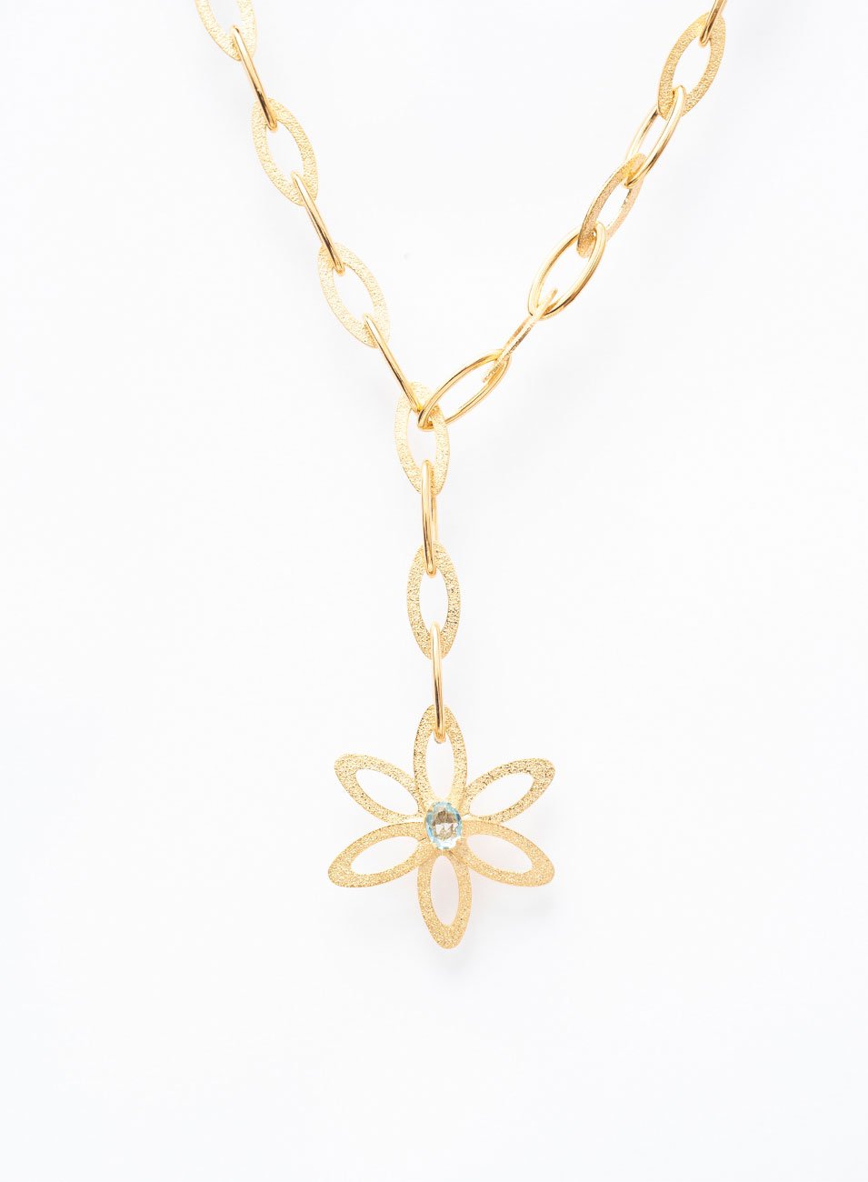 No centro da gravata, há um lindo pingente em forma de flor, adornado com um cristal acqua marine, que acrescenta um toque de cor e brilho à peça. O contraste entre o banho de ouro e o cristal acqua marine cria uma combinação encantadora e elegante.