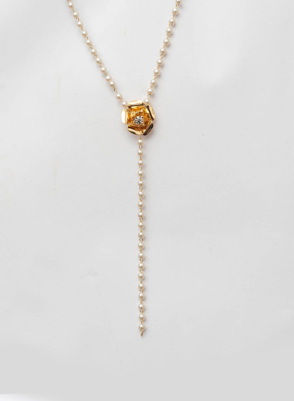 A corrente de mini pérolas brancas que segue o pingente flor complementa perfeitamente o design, adicionando um movimento sutil e fluidez ao colar, criando uma composição harmoniosa e deslumbrante.